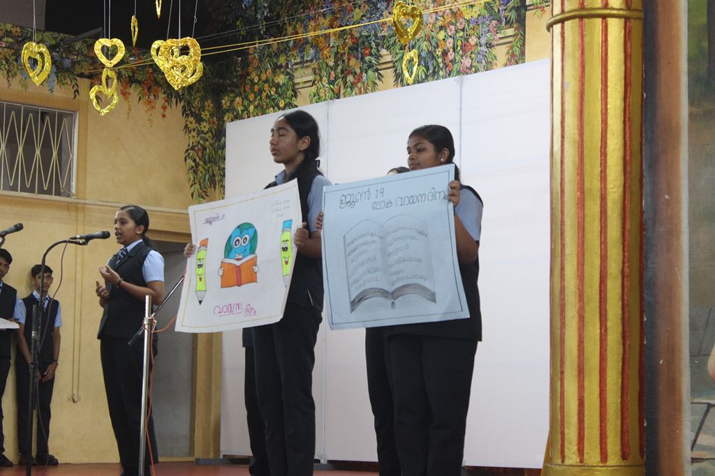 The entire morning assembly was conducted in Malayalam, centered around the theme “World Reading Day,” creating a vibrant linguistic and literary atmosphere.